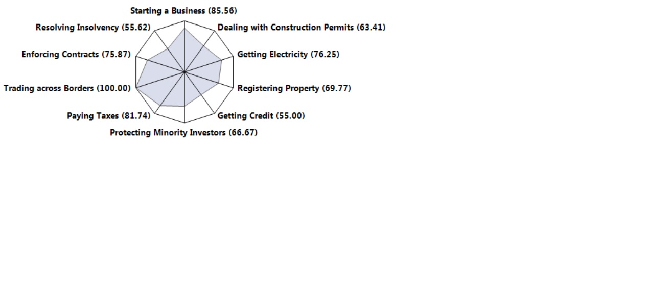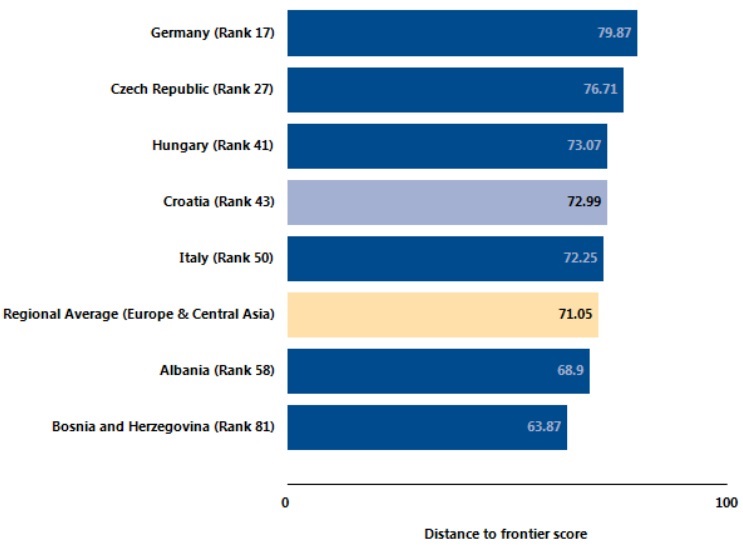 Usporedba Hrvatske sa susjednim zemljama, prosjekom regije te s Njemačkom pokazuje kako se Hrvatska prema DTF-u nalazi u društvu Italije i Mađarske te iznad regionalnog prosjeka (Slika 2). Iz navedenog se može zaključiti da lakoća poslovanja u Hrvatskoj nije na toliko niskoj razini. Ipak, postoji mnogo prostora za napredak. Doing Business 2017 može biti dobar poticaj prema naprijed.