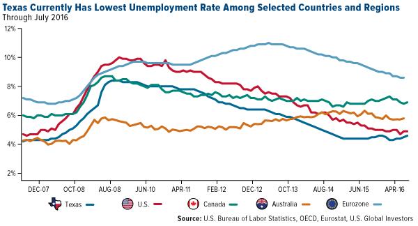Texas ima potencijal radne snage od 13 milijuna ljudi koji mogu generirati ovako pozitivne ekonomske performanse. U Texasu se godišnje otvori preko 100 000 radnih mjesta (175.700 u 2015.) što ga čini državom s vrlo niskom stopom nezaposlenosti (nižom od 5%). Procjenjuje se kako je tijekom američke ekonomske krize skoro polovica novih radnih mjesta stvorena upravo u poslovno prijateljskom Texasu.