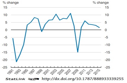Organizacija za gospodarsku suradnju i razvoj (OECD) u godišnjem pregledu za 2016. donosi ključne podatke o litvanskom gospodarstvu. BDP je tek 1995. Izašao iz postsocijalističke recesije. Snažniji rast, iznad 6% godišnje, započinje 2001. i traje do pada u duboku financijsku recesiju od 2008. Ipak, gospodarstvo se oporavlja već 2010. (za razliku od Hrvatske koja je izlazak u recesije dočekala tek 2015.). Najbolje godine su bile 2003. i 2007. kada je rast BDP-a bio okvirno 10% (a u Hrvatskoj također rekordnih cca. 5%).
